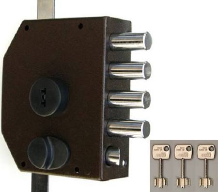 La serrure à 3 points se place dans la catégorie des serrures dites de sécurité (serrures multipoints) utilisées pour la fermeture de la porte d’entrée d’une habitation. Cette serrure ferme une porte en trois points de verrouillage. C’est, en général, la sécurité minimum requise par les compagnies d’assurance. Il s’agit de la serrure la plus utilisée.